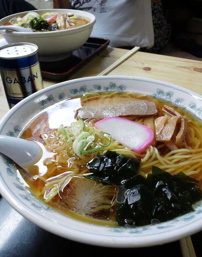 スープに浮いた氷がなければビジュアル的には普通の醤油ラーメンですね。冷し中華のように酢を効かせたものではなく、固めの麺にスッキリした醤油の味わい、真夏の涼麺として完全に有りですね。店の駐車場は地元ナンバーの車だけ、熱い普通のラーメンを注文される方もいて、地元で愛されている店なのだと感じました。ちなみに奥はKTM氏注文の大盛り、手前は普通盛り
